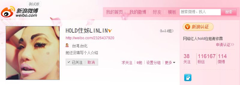 hold住姐本名谢依霖,就读于台湾文化大学表演专业,开学大四。她的微博多为一些自拍或者合影的照片。到今天早上,共发了114条微博,但是粉丝量却已达到了11万多个,被评论“增长神速”,更有不少博友表示期待hold住姐的新造型。在她关注的人当中则有刘若英、黄伟文、徐若瑄、罗志祥、舒淇等等。