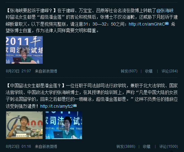 23日凌晨1点16分,网友“巴黎观察”在微博上公布一段时长为1分18秒的视频,视频内容为司法部司法行政学院副教授张海峡的讲课内容。在视频中,张海峡称,“凡是中国大陆的女孩子到法国留学的,回来之后都烂得一塌糊涂,都是超级潘金莲”。