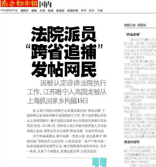 在上海工作的江苏睢宁人高国龙最近被“跨省追捕”了。因在网上发帖批评睢宁法院的执行工作,两个法官带队将他从上海抓回睢宁,睢宁法院以诽谤他人对其处以拘留15日并罚款1万元。2009年3月,同样在上海工作的河南灵宝人王帅因在网上发帖,遭家乡警方以诽谤“跨省追捕”,引起轩然大波。