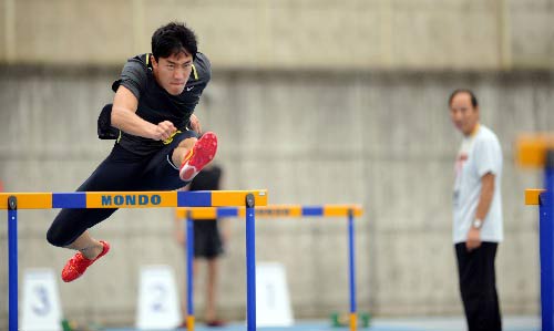 今天的这堂训练课一共持续了不到2个小时,在经过简单的牵拉和小肌肉群的练习之后,刘翔开始和史冬鹏以及江帆一起进行热身练习,随后刘翔穿上了一双比较显眼的红色跑鞋,教练孙海平和史冬鹏的师傅芦泉彬开始搭栏架,不过仅仅设置了3条道的3组栏架,显然从这个细节可以看出,刘翔即将开始起跑训练。