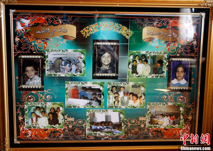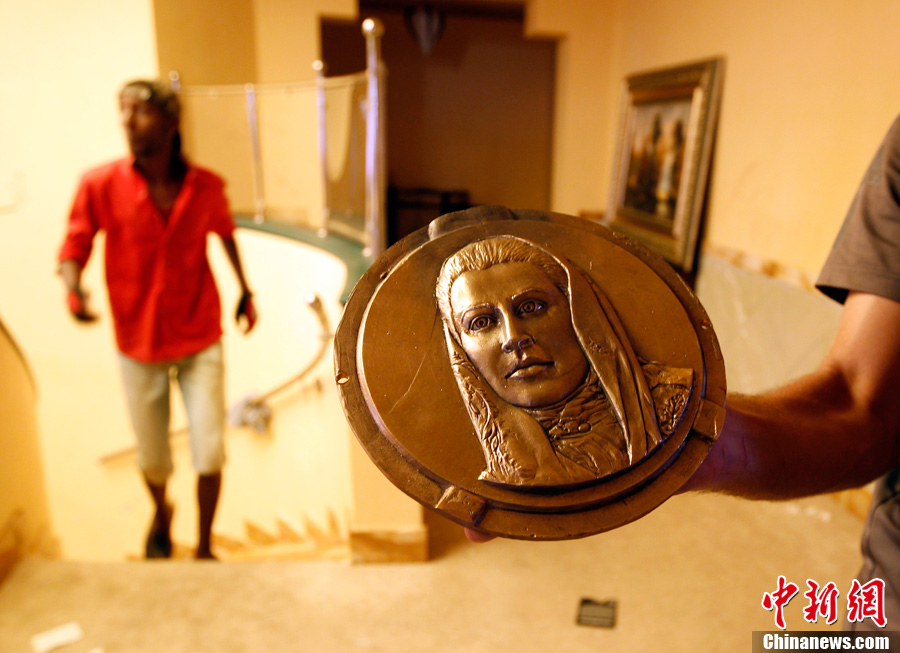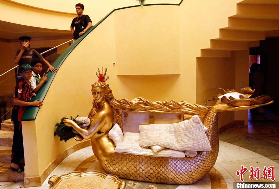 8月26日,拍摄于卡扎菲女儿阿伊莎住宅内的镀金沙发,沙发一头是阿伊莎的头像,造型就像一条美人鱼。阿伊莎的头像还出现在很多其它房间内。
