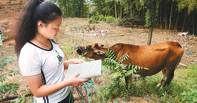 日前,湖南省涟源市石马山镇高三毕业生颜韶华边放牛边看书。颜韶华今年被北京市某高校录取,高考结束后她抓紧时间帮助父母干农活。