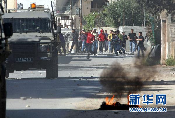 4月24日,巴勒斯坦民众与以色列士兵发生冲突。在约旦河西岸城市纳布卢斯,巴勒斯坦青年向以色列士兵巡逻车辆投掷石块。新华社发