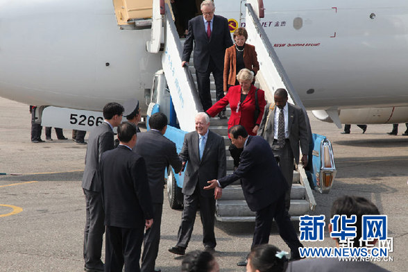 4月26日上午,美国前总统吉米·卡特乘坐包机抵达平壤顺安机场,与前来迎接的朝鲜外务省副相李勇浩握手。新华社记者张利摄
