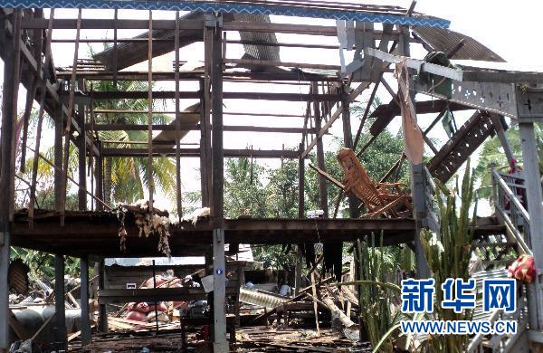 这张4月28日拍摄的照片显示的是柬埔寨奥多棉吉省柬泰边境地区一座被炮火炸毁的房子。柬埔寨与泰国边境前线指挥官28日举行谈判,双方一致同意无条件停止已持续了7天的边境武装冲突。 新华社发(索万纳拉摄)