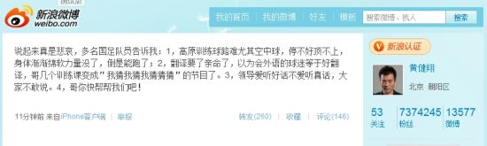 同时黄健翔还透露:说起来真是悲哀,多名国足队员告诉我:1.高原训练球路难尤其空中球,停不好顶不上,身体渐渐绵软力量没了,倒是能跑了;2.翻译要了亲命了,以为会外语的球迷等于好翻译,哥几个训练课变成"我猜我猜我猜猜猜"的节目了。3.领导爱听好话不爱听真话,大家不敢说。4.哥你快帮帮我们吧!