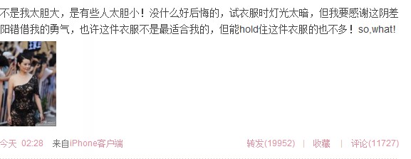 今早儿,袁立自己也说:“不是我太胆大,是有些人太胆小!没什么好后悔的,试衣服时灯光太暗,但我要感谢这阴差阳错借我的勇气,也许这件衣服不是最适合我的,但能hold住这件衣服的也不多!
