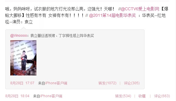 8月28日,袁立在微博上惊呼自己的衣服好可怕,原来她并不知道这身时髦的衣服在强闪光灯下的会呈现出“赤裸裸”的效果。好在袁莉一向豪爽,过了一会,又见她发微博说“算了,反正都这样,就当是天气热,凉快!”