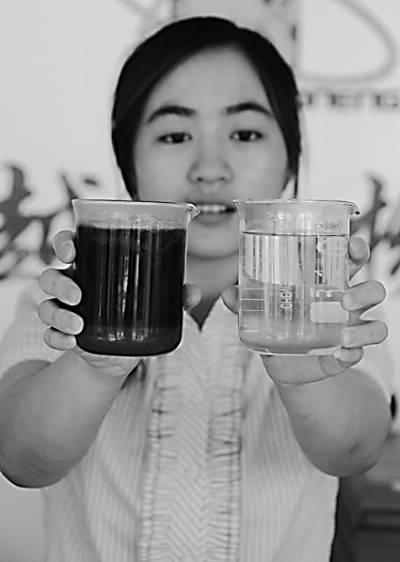 厦门卓越生物质能源有限公司工作人员用玻璃烧杯向记者展示了一杯原料“地沟油”(左)和一杯成品生物柴油(右)。相比之下,“地沟油”呈浑浊的黑褐色,并有酸腐臭味,而生物柴油色泽透明澄净,略带芳香气味(8月27日摄)。