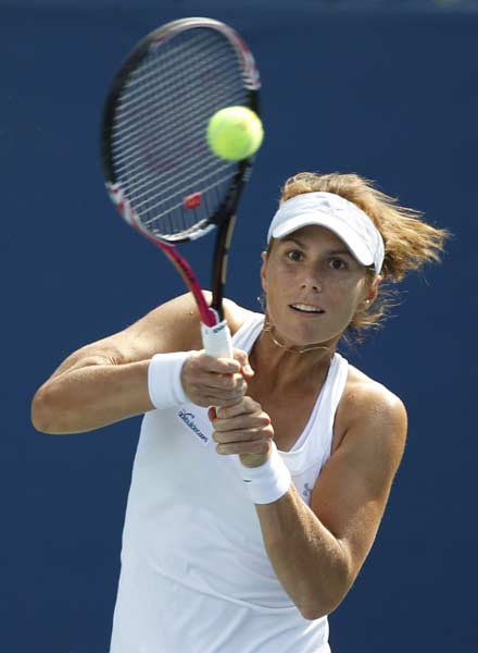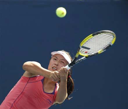 北京时间8月30日凌晨,2011赛季美国网球公开赛继续进行女单首轮比赛的争夺,赛会13号种子、我国金花彭帅发挥出色,面对自己此前从未交手过的本土球员勒普琴科她耗时1小时26分钟以6-3/6-4直落两盘取胜,顺利晋级第二轮。中国金花第二轮中的对手将在法国猛女拉扎诺和保加利亚名将皮隆科娃之间产生。图为比赛精彩瞬间。