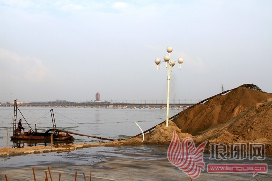 在沂河西岸,采砂船在清理河底淤泥淤沙。