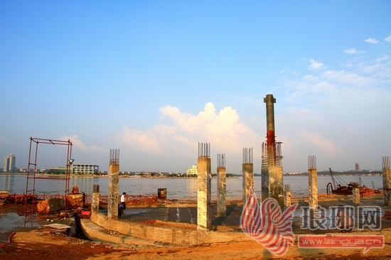在沂河西岸,滑水赛看台已初现雏型,工人正在紧张的施工。