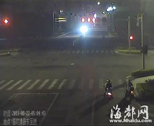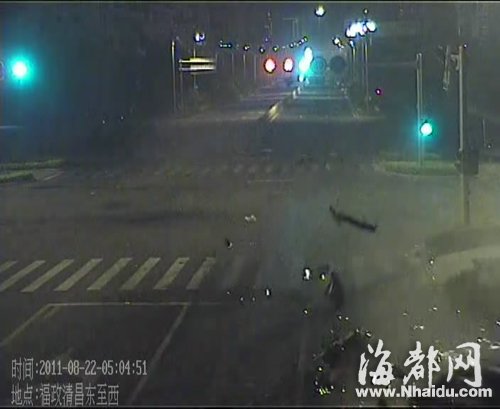 监控视频显示,8月22日凌晨5时,天刚蒙蒙亮,福清市清昌大道与福政路交叉口,车流稀少,十字路口的红绿灯分外醒目。