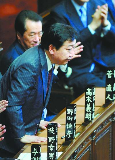 野田佳彦8月30日在日本国会众议院首相指名选举中当选新一届首相。现任首相菅直人当天上午在内阁会议上接受所有内阁大臣的辞呈后宣布内阁总辞职。野田可能于9月2日组建新一届内阁。新华社记者 季春鹏摄