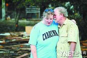 28日,美国北卡罗来纳州的两位居民面对在风暴中被毁的家园相互安慰
