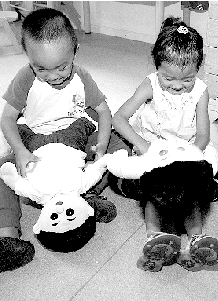 侯老师抱来一堆布娃娃,孩子们人手一个。这些布娃娃和平时见到的布娃娃差别不大,男的穿着衬衣和裤子,女的穿着裙子。