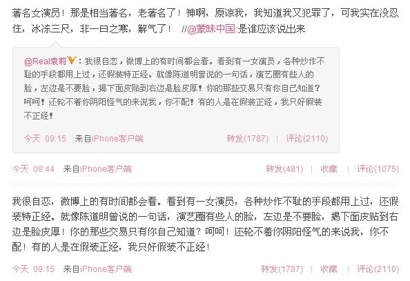 袁莉微博:“看到有一女演员,各种炒作不耻的手段都用上过,还假装特正经。就像陈道明曾说的一句话,演艺圈有些人的脸,左边是不要脸,揭下面皮贴到右边是脸皮厚!你的那些交易只有你自己知道?呵呵!还轮不着你阴阳怪气的来说我,你不配!有的人是在假装正经,我只好假装不正经!”