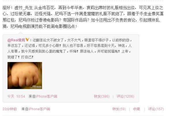 之后,袁莉又连发微博大泄心中愤懑。记者猜想可能与前几天袁莉穿透视装受到某些人士的攻击所以才出言暗讽。