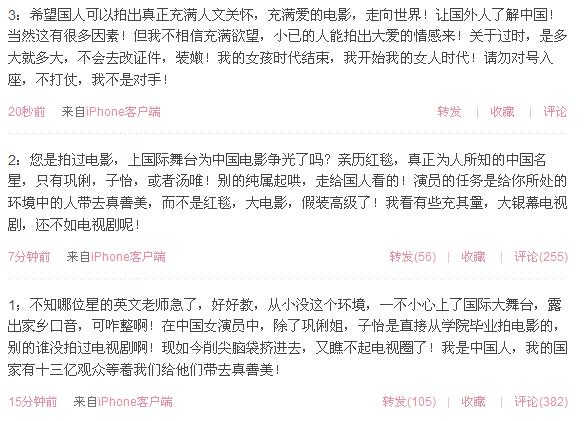 1:不知哪位星的英文老师急了,好好教,从小没这个环境,一不小心上了国际大舞台,露出家乡口音,可咋整啊!在中国女演员中,除了巩俐姐,子怡是直接从学院毕业拍电影的,别的谁没拍过电视剧啊!现如今削尖脑袋挤进去,又瞧不起电视圈了!我是中国人,我的国家有十三亿观众等着我们给他们带去真善美!