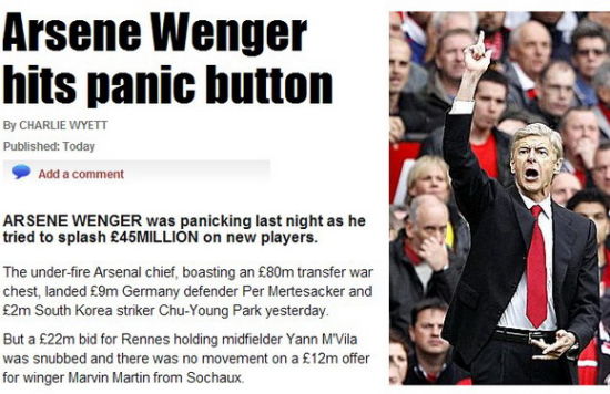 《太阳报》以“温格按下紧急按钮”为题,披露了阿森纳最后的疯狂计划,该报称,温格准备在新球员身上花出4500万英镑,对阵容进行大的修补。