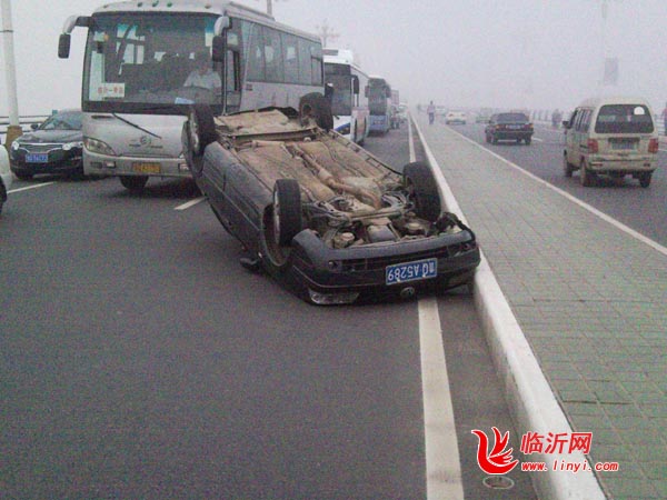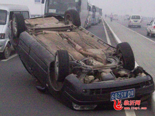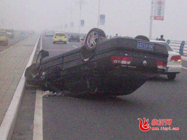 临沂网讯 记者了解到,九月一日早上七点,金一路桥上发生严重车祸,一辆由西向东行驶的桑塔纳汽车与迎面而来的三轮车发生交通事故,桑塔纳为躲避三轮车,紧急调转方向,导致汽车失去控制,发生翻车,图为全车翻车的情况。