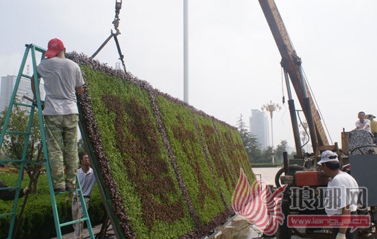 记者在市政府大楼前的广场上看到,标语由12块3米高、2.5米宽的大型五色草组成,六位工作人员正忙着焊接支撑架、安装造型。负责人徐凯告诉记者,这些标语都是用一种叫五色草的植物制作而成,这种利用植物制作的立体造型,有形式新颖,美化效果好,使用时间长,环保又低碳等多种优点,是城市美化的一种新趋势,可以用来制作各种造型,这次制作的标语造型,在一个月前就开始培育制作。