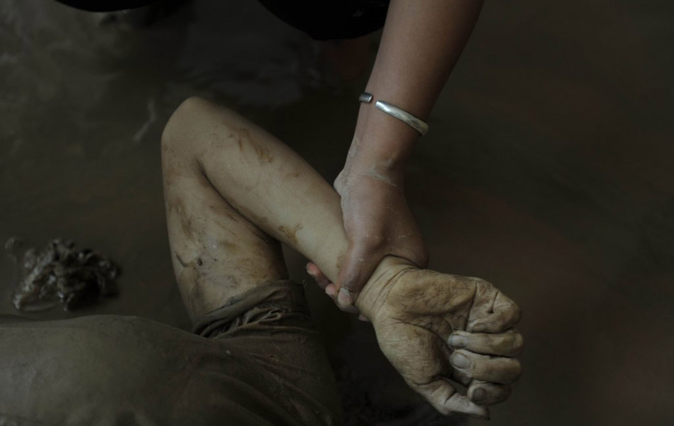 一名家属握着一名抢救无效的遇难者的手。