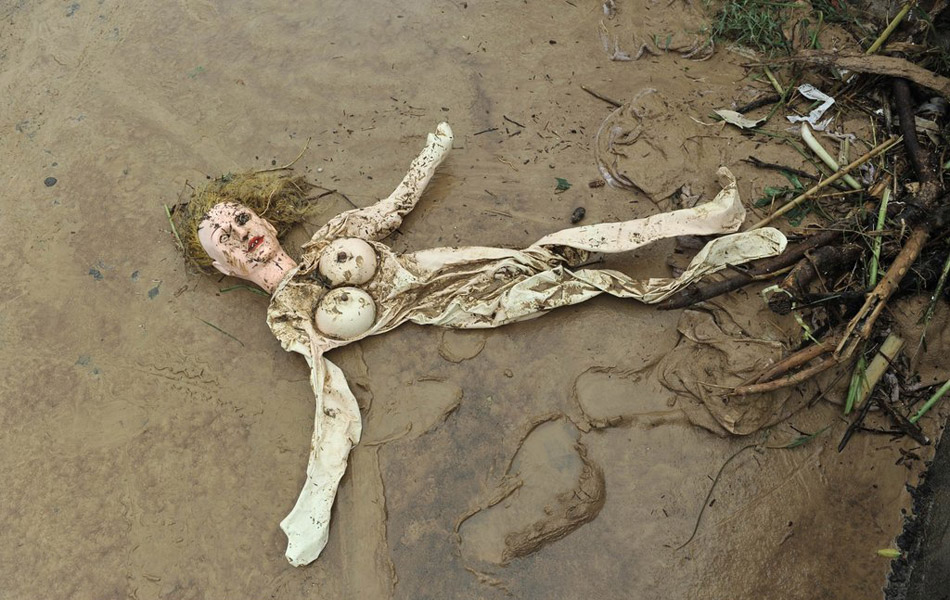 被洪水冲到街头的冲气娃娃。