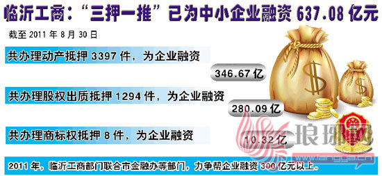 截至2011年8月30日,临沂工商部门共办理动产抵押3397件,为企业融资346.67亿元;办理股权出质抵押1294件,为企业融资280.09亿元;办理商标权抵押8件,为企业融资10.32亿元。“三押一推”共为临沂市中小企业融资637.08亿元。