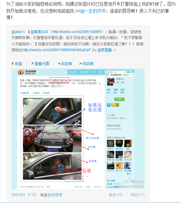 8月29日,沈阳市民常先生在微博上,图文并茂地介绍了自己当天的一段遭遇。照片中一名身穿警服的男子,戟指怒斥镜头方向气场超强。这条微博在短短5个多小时的时间里,被转发700多次,200多人参与评论。