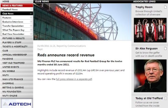 与此同时,曼联过去一个财年的总收入,也创造了惊人的纪录。截止到2011年6月30日,梦剧场球队过去一个财年的总收入达到了3.314亿英镑,这比之前的一个财年的收入上涨了4500万英镑。也就是说,曼联的总收入增加了16%,同时也是曼联单财年收入首度跨过3亿英镑大关。