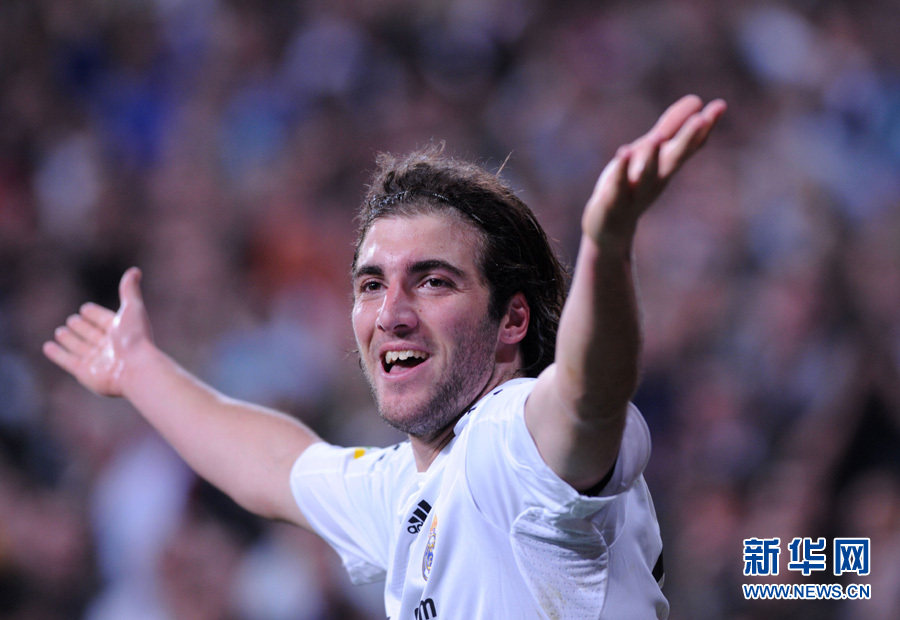 图为2009年4月21日,皇家马德里队球员伊瓜因庆祝进球。新华社记者陈海通摄