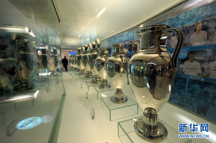 图为皇家马德里队主场荣誉展室内展出的九座欧冠冠军奖杯(5月1日摄)。新华社记者陈海通摄