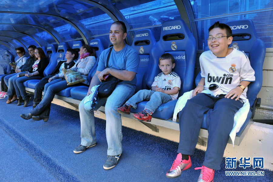 图为5月1日,一些球迷在伯纳乌球场的球员席位体验球星感受。新华社记者陈海通摄