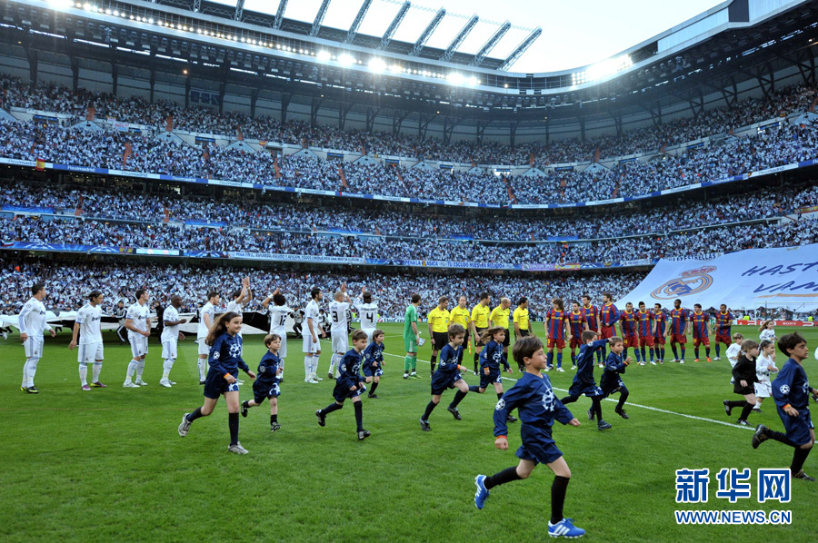 图为4月27日,在伯纳乌球场的比赛即将开始时,球童离场。新华社记者陈海通摄