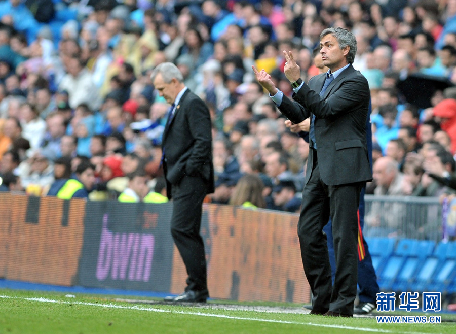 图为4月30日,皇家马德里队主教练穆里尼奥在伯纳乌球场场边指挥。新华社记者陈海通摄