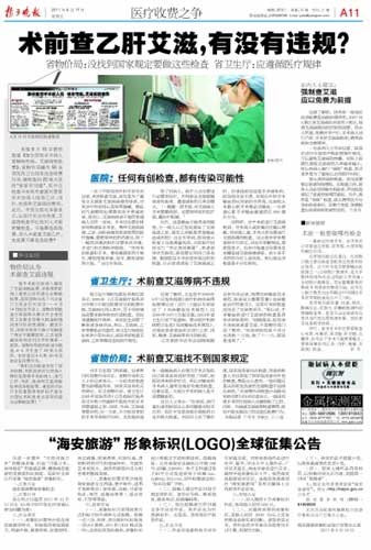 医院的乱收费行为经曝光后很快引起行业内的争论,本报于6月17日进行了跟进报道。“术前检查艾滋,首先是为了避免交叉感染,对于携带艾滋病病毒的患者,医院对其诊疗的安排以及所用的器械、物品和代谢物的处理都有别于普通患者,另一方面手术时也要安排到特殊的手术室。”有医院方面的人士对记者说。一句话,医院方面认为,对手术病人做乙肝、丙肝、艾滋、性病的检查也是出于对患者的安全考虑。省卫生厅方面也表示,术前的这些检查都是行规,并没有违反医疗规范。