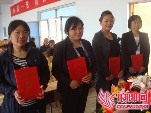 5月1日,临沭县大兴镇嘉禾村魏秀芳(左一)、大高埠村杨大芹(左二)、高埠新村伏胜花等21名计生专职人员喜领村委委员当选证书,成为名副其实的“女村官”。