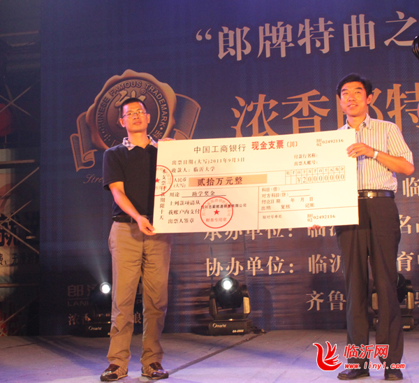 临沂大学副校长刘占仁接过20万元支票。