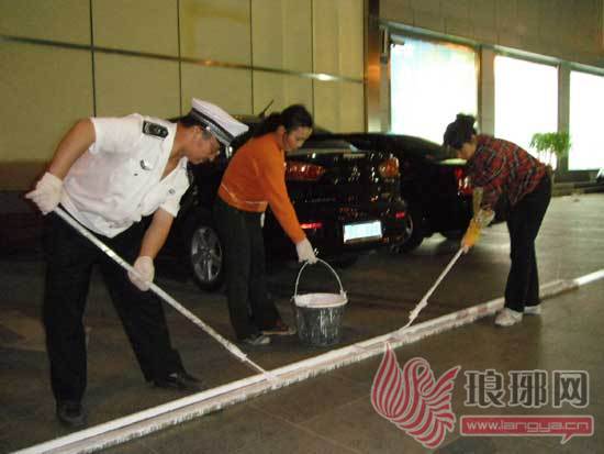 工作人员在施划停车位