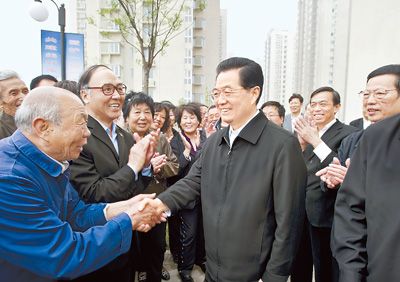 四月二十九日至五月一日,中共中央总书记、国家主席、中央军委主席胡锦涛在天津考察工作。这是胡锦涛在保障性住房小区秋怡家园亲切看望居民,了解他们的住房改善情况。