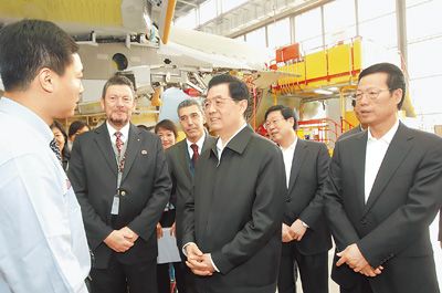 在中欧合资空中客车天津总装有限公司整洁明亮的车间里,胡锦涛看工作流程、问组装技术,仔细了解企业生产经营情况。外方管理人员介绍说,公司投产两年多已累计交付46架空客A320系列飞机,产品质量完全达到欧洲标准,中国员工的管理能力和技术水平都很棒。胡锦涛高兴地说:“空客天津总装公司项目合作成功,再次表明中欧经济合作有着巨大潜力和广阔前景。希望中欧经济合作取得更多成果。”胡锦涛表示,中方与空客公司有着良好合作。今后一个时期,中国航空市场仍有较大增长空间,应进一步加强合作。胡锦涛还兴致勃勃登上一架正在组装的飞机,认真察看舱内设备。总书记对中方员工说,飞机制造属于高端制造业,质量要求非常严格。希望大家始终坚持质量第一、安全至上,切实做到一丝不苟、精益求精。