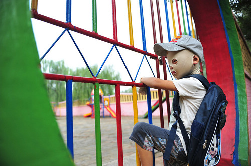 记者跟随王寿武一家前往学校,因为走得比较早,到学校后,大门还没有开,湘湘就趴在门上向里面好奇地张望着。过了一会儿,其他小朋友陆续来到学校,戴着面具的湘湘引起了孩子们的注意,但湘湘没有觉得自己和其他人有什么不同,甚至在几个孩子被他吓哭后,他还走过去安慰人家。