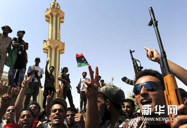 9月6日,在利比亚拜尼沃利德城附近,反对派武装人员相互庆祝。新华社/法新