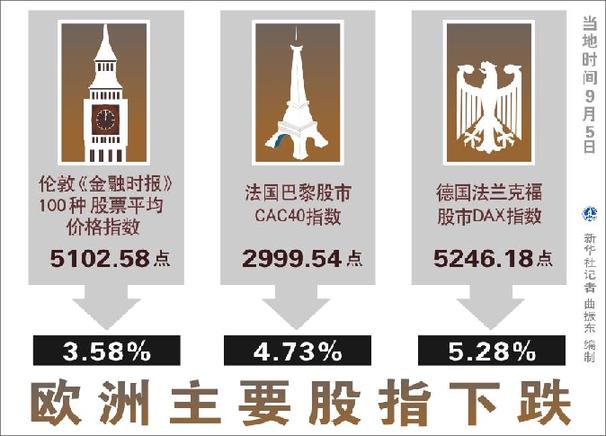 9月5日,欧洲股市惨不忍睹,在这“黑色星期一”普遍大跌5%左右。法兰克福DAX30指数跌幅最大,达5.28%,跌至两年来最低点。巴黎CAC40指数下跌4.73%,是2009年7月10日以来首次跌破3000点。