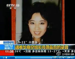 2001年9月11日,就在本·拉登属下的恐怖分子驾驶美国航空公司的客机撞向世贸大楼北塔之前,一位勇敢的华裔空姐美国航空公司11号航班上的乘务员邓月薇给她所在的航空公司打电话求救,报告飞机上发生了劫机事件。她在电话中说:“我想我们被劫持了。”“有商务舱的人被刺伤了,我觉得那里有有毒气体,我们不能呼吸,我也不知道我们的飞机被劫持了。”