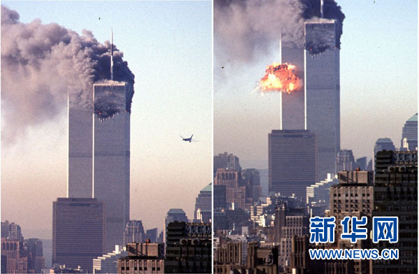 这是当日纽约世界贸易中心遭受飞机撞击的组照。新华社发