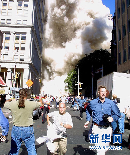 这是2001年9月11日行人们在纽约世贸中心大楼受恐怖袭击倒塌后惊慌奔走的资料照片。