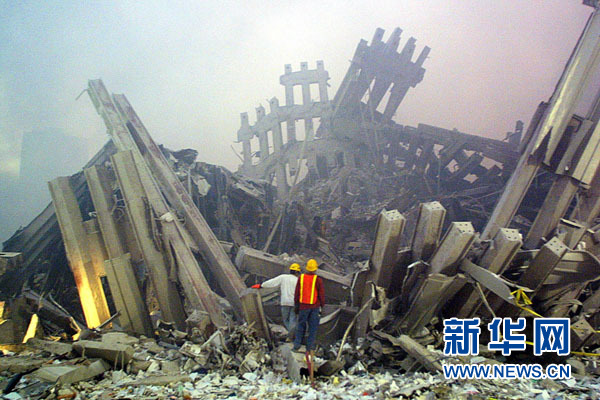 这是2001年9月11日营救人员在纽约世贸中心恐怖袭击现场的资料照片。