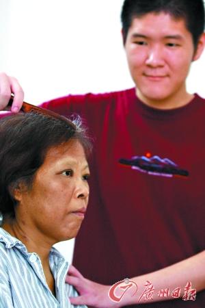 资料图:手术成功后,儿子在病房里为妈妈梳头。